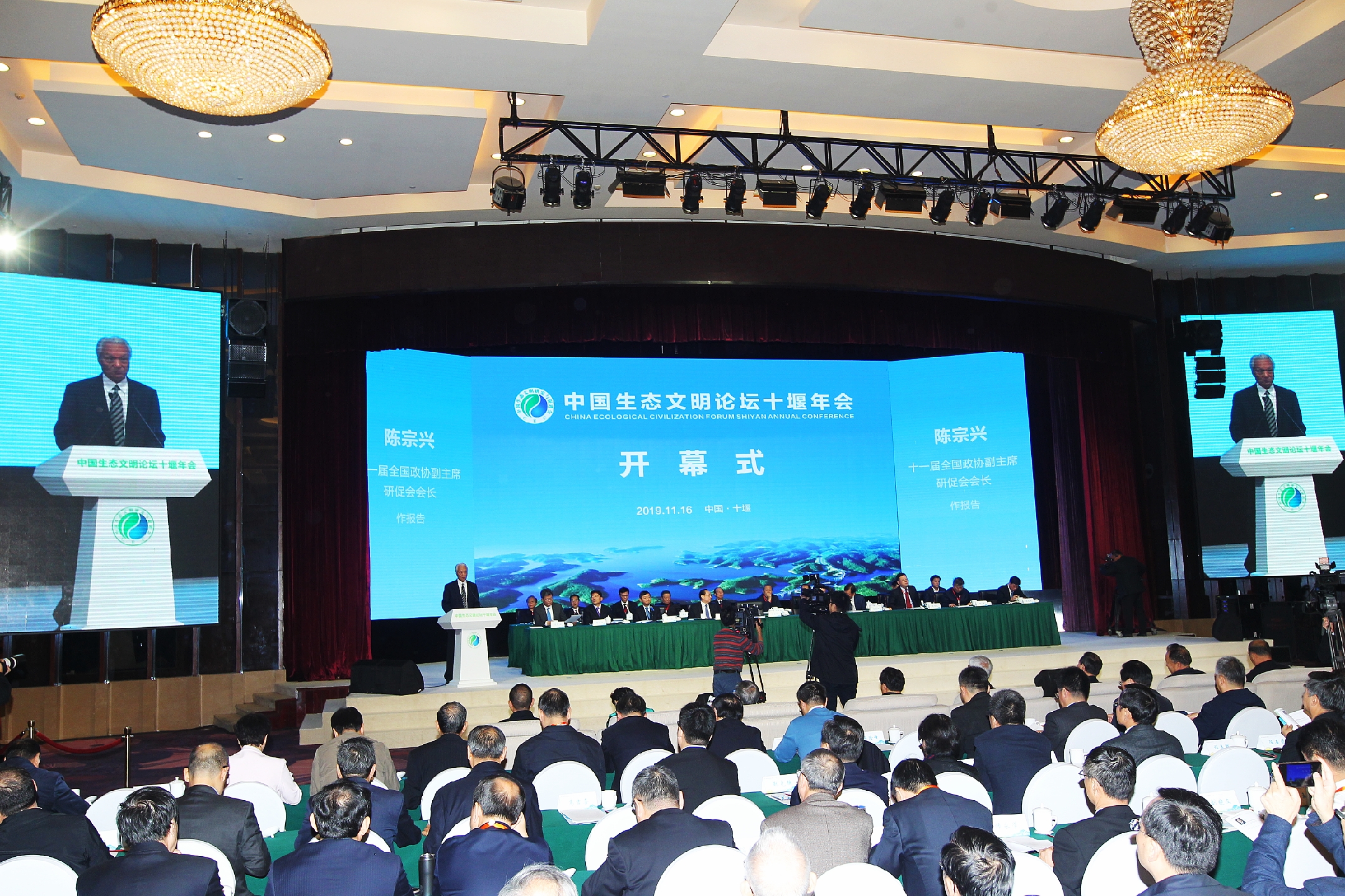 11月16日至17日,中国生态文明论坛年会在湖北省十堰市召开。本次会议以“生态文明 和谐共生——打好污染防治攻坚战,推动高质量发展”为主题。十一届全国政协副主席、中国生态文明研究与促进会会长陈宗兴,生态环境部党组书记、部长李干杰出席开幕式并讲话,湖北省委副书记、省长王晓东,湖北省政协副主席、十堰市委书记张维国出席开幕式并致辞。生态环境部副部长黄润秋主持开幕式。