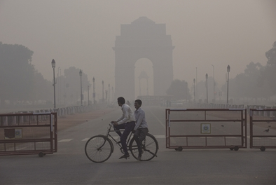 印度首都新德里遭遇严重空气污染,能见度低下,城市被雾霾笼罩。