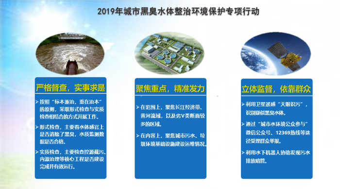 二是实施2019年城市黑臭水体整治专项行动,以长江经济带和黄河流域地级及以上城市为重点,深入现场抽查督查。全国295个地级及以上城市(不含州、盟)建成区共有黑臭水体2899个,消除86.7%。其中,36个重点城市(直辖市、省会城市、计划单列市)有黑臭水体1063个,消除96.2%;259个其他地级城市有黑臭水体1836个,消除81.2%。