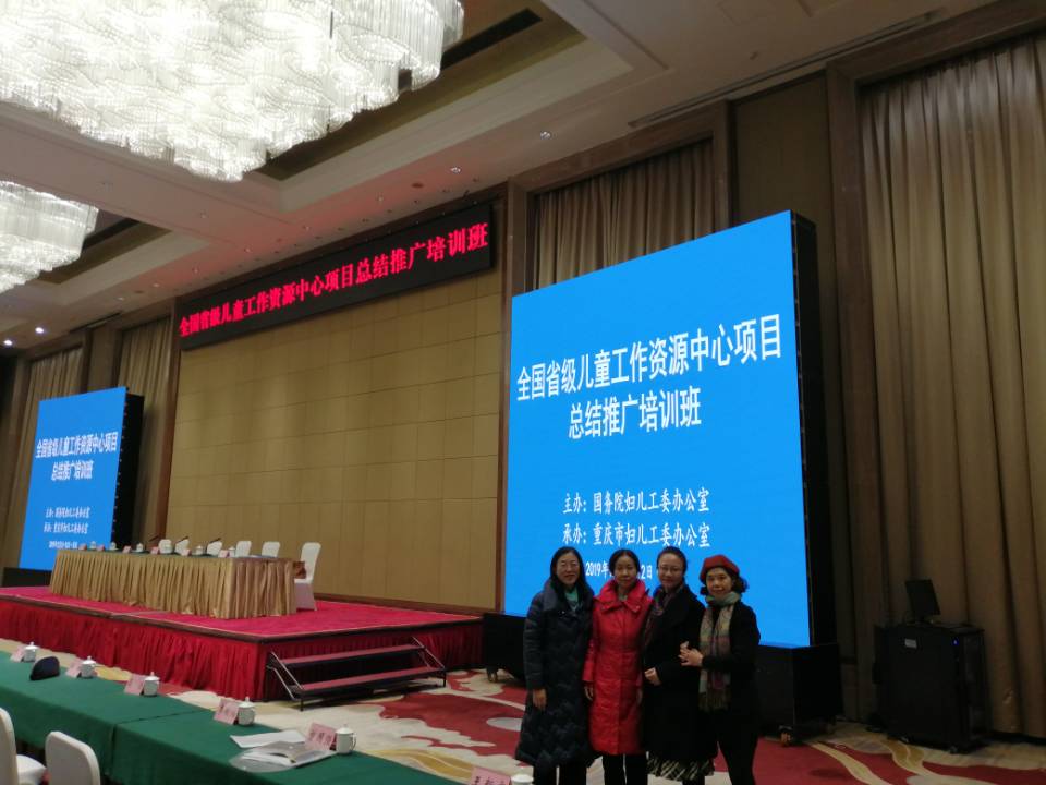 2019年12月11日由国务院妇儿工委办公室主办、重庆市妇儿工委办公室承办的“全国省级儿童工作资源中心项目总结推广培训班”在重庆市雾都宾馆举行。重庆市政府副市长李明清、联合国儿基会马杰、全国妇联副主席谭琳、国家妇女儿童工作委员会办公室常务副主任王卫国、国务院妇儿工委办副主任宋文珍、重庆市妇联主席万相兰出席了开班仪式。全国各省级儿童工作资源中心、相关妇联和妇儿工委办与重庆市各区县代表、重庆市儿童工作资源中心专家代表参加了培训班培训与会议研讨。
