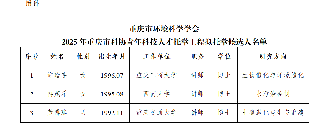 附件:重庆市环境科学学会2025年重庆市科协青年科技人才托举工程拟托举候选人名单