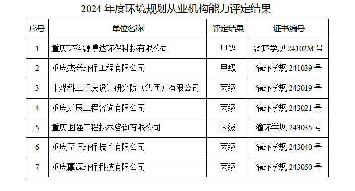根据《重庆市环境科学学会关于印发环境规划从业机构能力评定工作规程的通知》(渝环学〔2024〕15号)的规定,环境规划专业委员会组织开展了2024年度评定工作。在会员单位自愿申请基础上,经初核、专家组评审、公示等程序,现向重庆环科源博达环保科技有限公司、重庆杰兴环保工程有限公司、中煤科工重庆设计研究院(集团)有限公司、重庆龙辰工程咨询有限公司、重庆图强工程技术咨询有限公司、重庆至恒环保技术有限公司、重庆禀源环保科技有限公司等7家单位授予相应评定证书,公布新增认定环境规划专业技术人员19名(名单附后)。