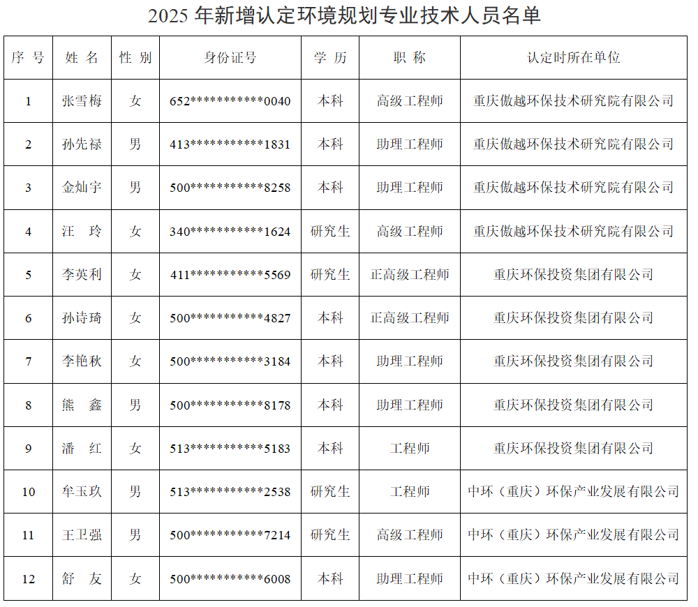 经有关单位自愿申请,重庆市环境科学学会组织专家组对相关单位的环境规划能力进行了评定。评定结果为:重庆傲越环保技术研究院有限公司、重庆环保投资集团有限公司评定为环境规划乙级从业机构,中环(重庆)环保产业发展有限公司评定为环境规划丙级从业机构,新增认定环境规划专业技术人员12名。