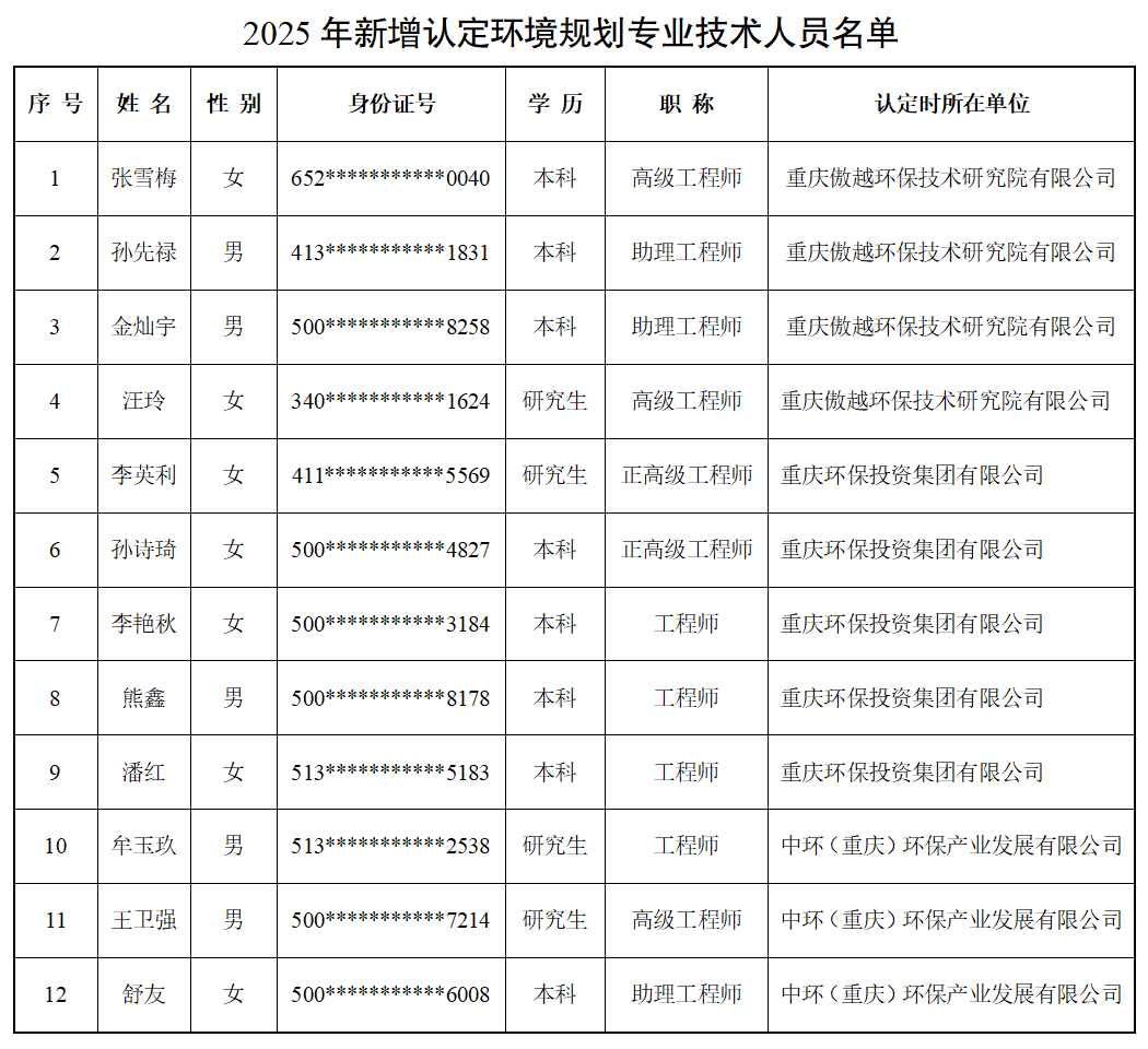 根据《重庆市环境科学学会关于印发环境规划从业机构能力评定工作规程的通知》(渝环学〔2024〕15号)的规定,环境规划专业委员会组织开展了2025年度评定工作。在会员单位自愿申请基础上,经初核、专家组评审、公示等程序,现向重庆傲越环保技术研究院有限公司、重庆环保投资集团有限公司、中环(重庆)环保产业发展有限公司等3家单位授予相应评定证书,公布新增认定环境规划专业技术人员12名(名单附后)。