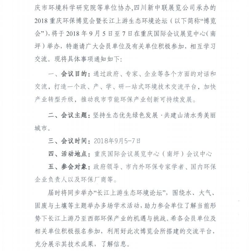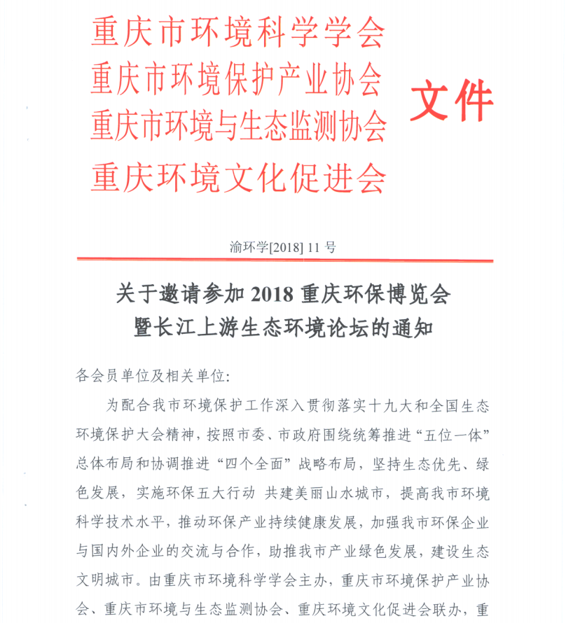关于邀请参加2018重庆环保博览会暨长江上游生态环境论坛的通知