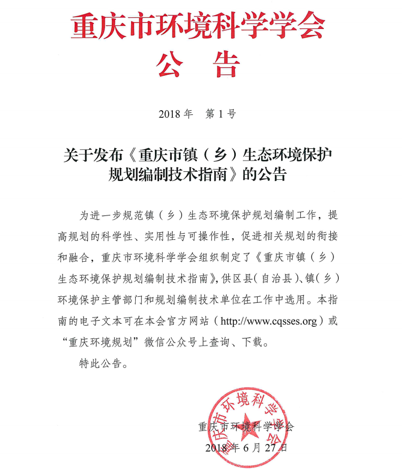 关于发布《重庆市镇(乡)生态环境保护 规划编制技术指南》的公告