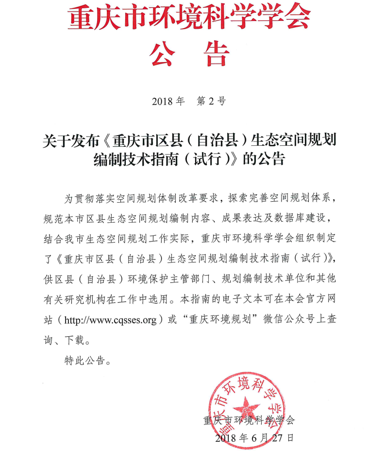 关于发布《重庆市区县(自治县)生态空间规划 编制技术指南(试行)》的公告