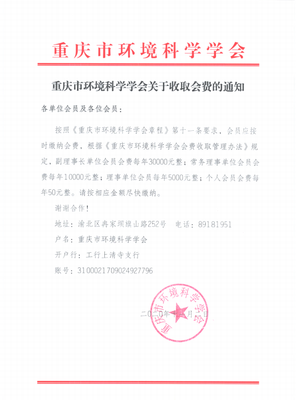 重庆市环境科学学会关于收取会费的通知