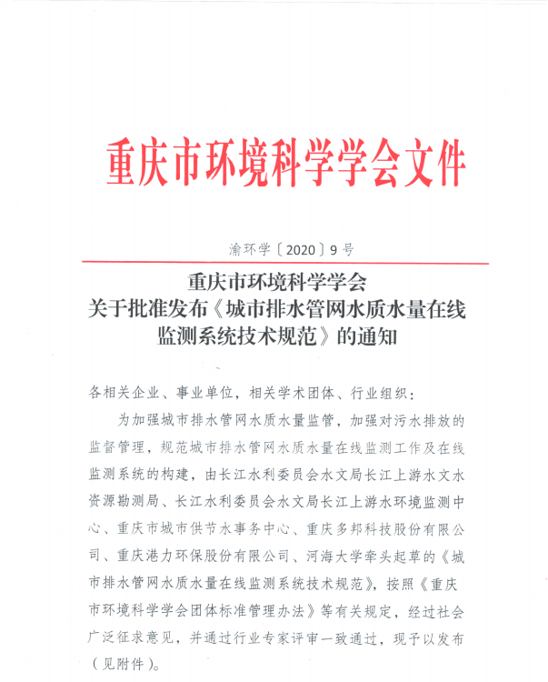 重庆市环境科学学会关于批准发布《城市排水管网水质水量在线监测系统技术规范》的通知