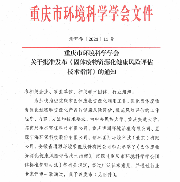 重庆市环境科学学会关于批准发布《固体废物资源化健康风险评估技术指南》的通知
