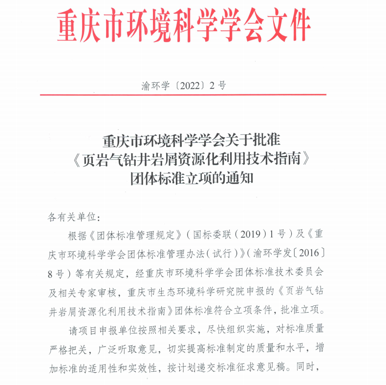 重庆市环境科学学会关于批准《页岩气钻井岩屑资源化利用技术指南》团体标准立项的通知