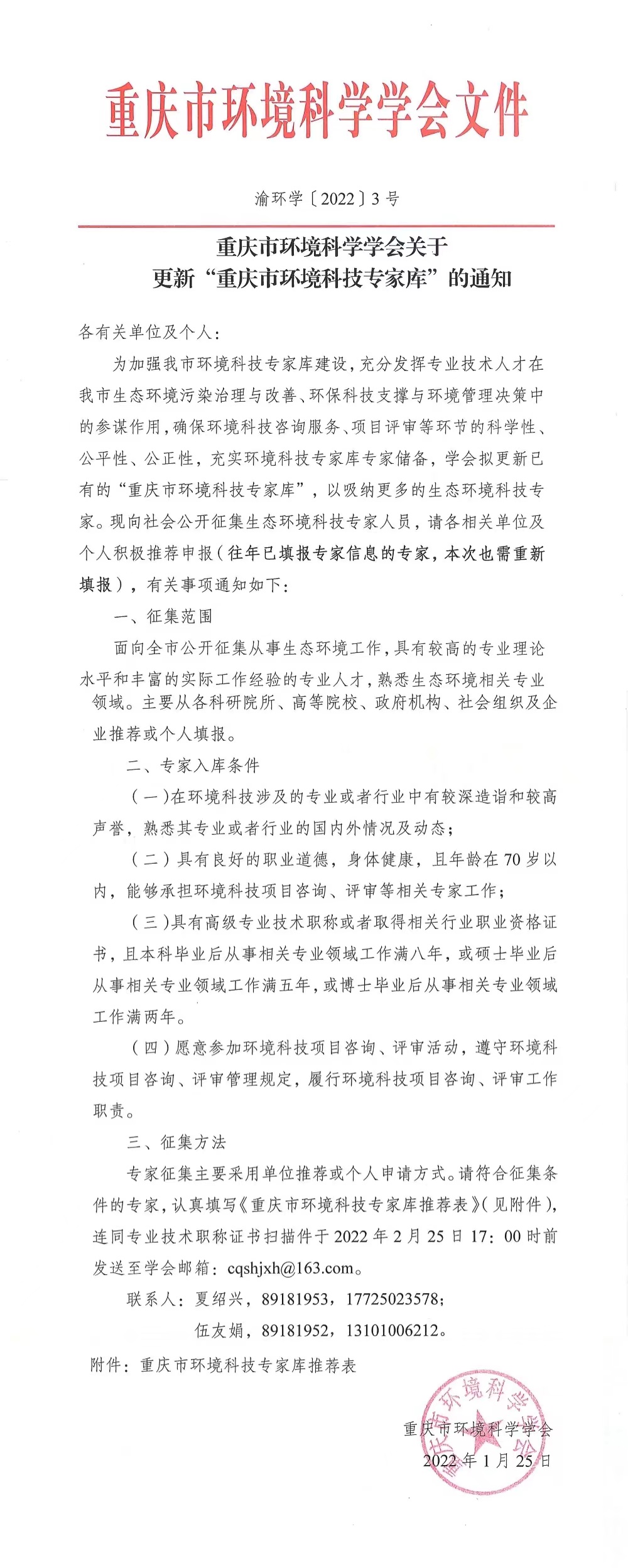 重庆市环境科学学会关于更新“重庆市环境科技专家库”的通知