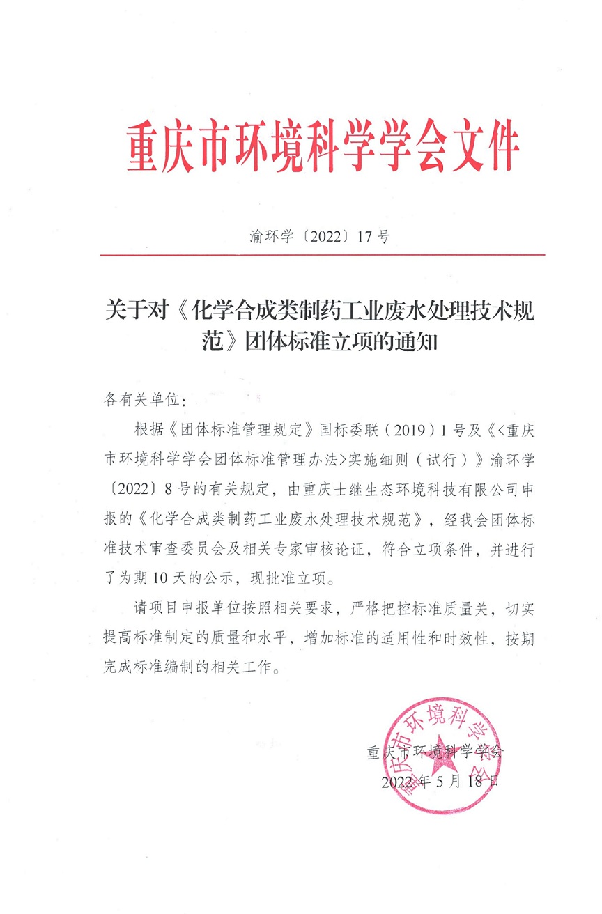 关于对《化学合成类制药工业废水处理技术规范》团体标准立项的通知