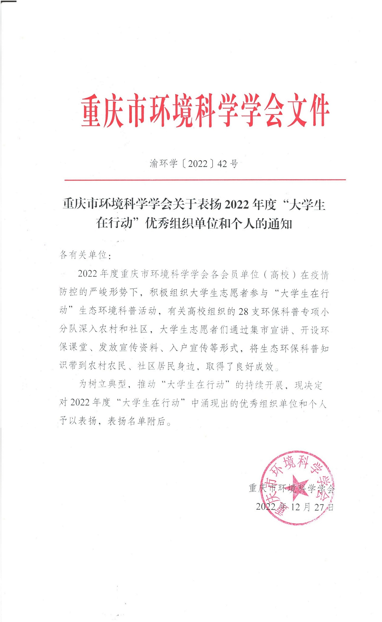 2022年度重庆市“大学生在行动”环保科普活动表彰名单