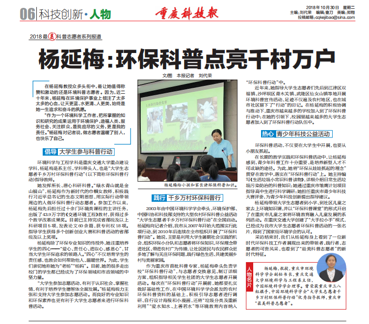 作为重庆市首批科普专家,杨延梅牵头负责学校“环保科普行动”,与志愿者交换意见、制订详细方案,组织指导相关学生社团的大学生志愿者开展活动。每次在“环保科普行动”开展前,她都要扎实做好基础性工作,在中国环境科学学会派发的农村环保科普资料的基础上,积极引导志愿者进行调研、自行设计海报和小漫画,还将“垃圾分类及重新利用”“爱水知水、上善若水”等环境教育内容纳入“环保科普行动”中。