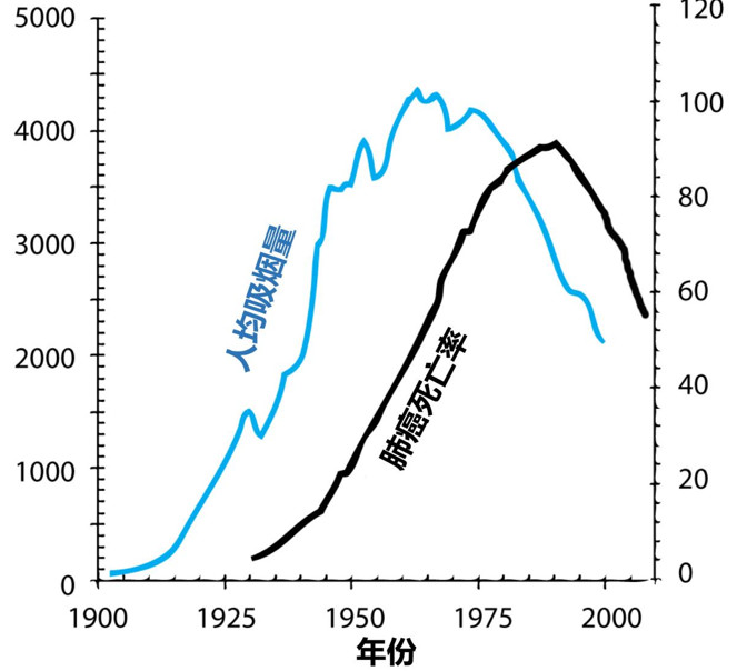 类似的,美国数据明确显示,人均吸烟量和肺癌发病率直接相关,但是两个曲线相差20年,也就是说吸烟导致肺癌平均需要20年左右,而控烟后整体肺癌下降也需要20年左右。