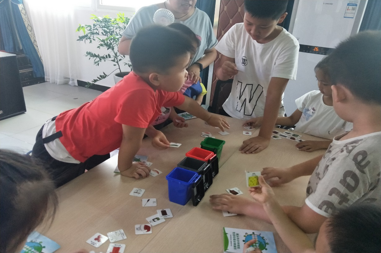 之后,志愿者带领小朋友们进入了将垃圾分类的游戏环节。小朋友们异常踊跃地参与互动。活动中,志愿者讲解垃圾分类相关知识,利用儿童之家提供的四个分类垃圾桶,引导小朋友们正确对待垃圾,合理利用废品。互动游戏中,小朋友们分组竞赛,通过趣味卡片和垃圾桶模型,回顾课堂知识,加深垃圾分类印象。