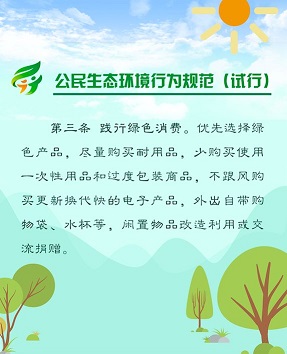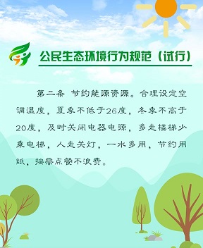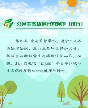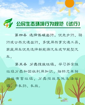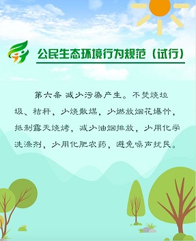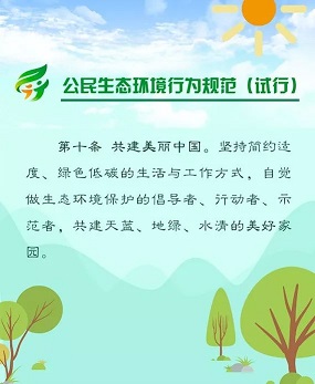 2018年6月5日,生态环境部、中央文明办、教育部、共青团中央、全国妇联等五部门联合发布《公民生态环境行为规范(试行)》,倡导简约适度、绿色低碳的生活方式,引领公民践行生态环境责任,携手共建天蓝、地绿、水清的美丽中国。点击图片看《规范》详细内容。