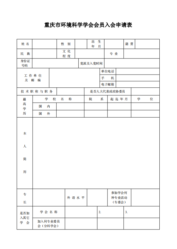 重庆市环境科学学会会员入会申请表